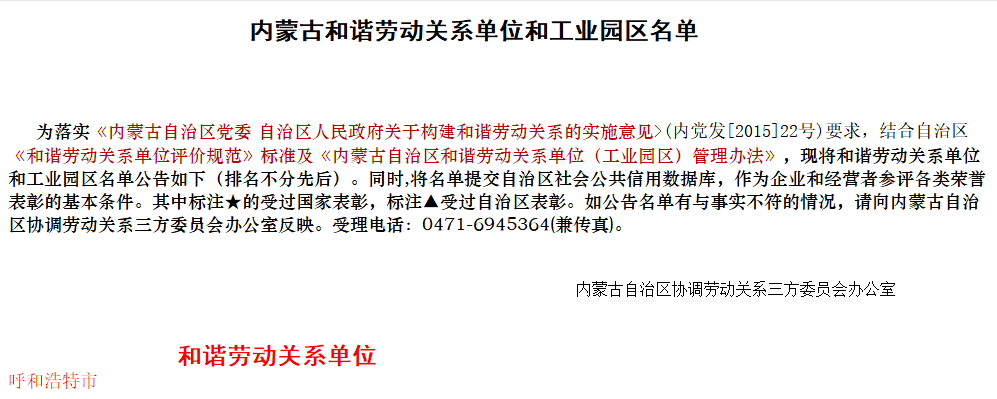內蒙古自治區和諧勞動關系單位的光榮稱號。
